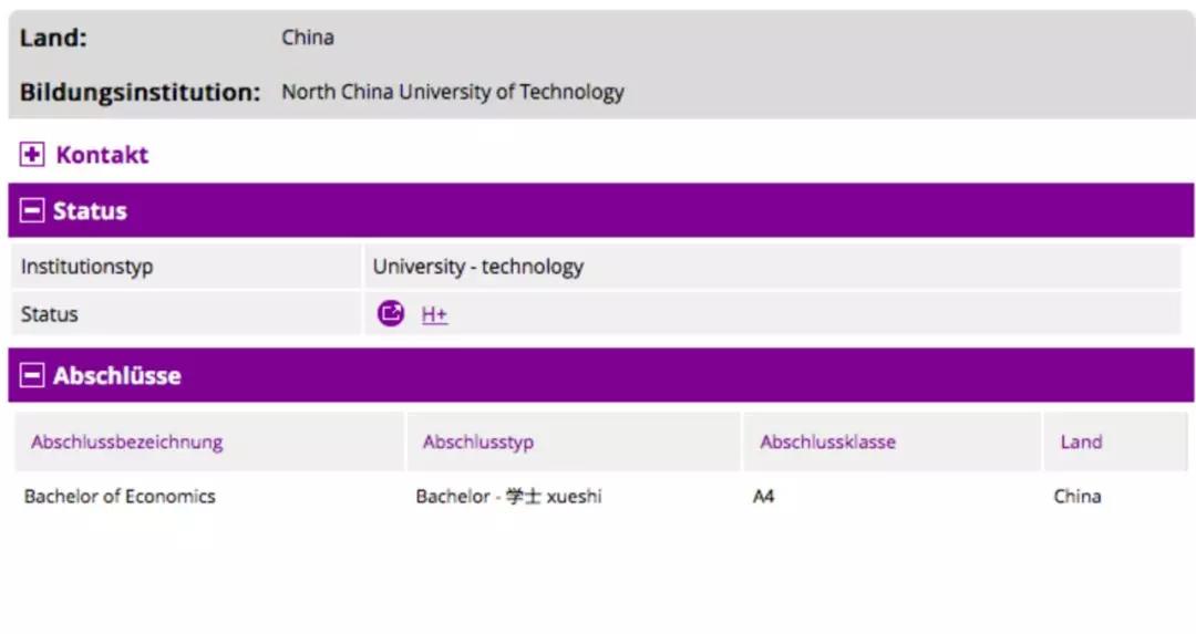 如果你的大学如下图得到了H+ 的评级,你所取得的学位也显示在下方并得到了评级,那么恭喜你,你的学历和学位已经是德国认可的。申请签证时只需提交学历学位德文翻译公证件就可以了。
